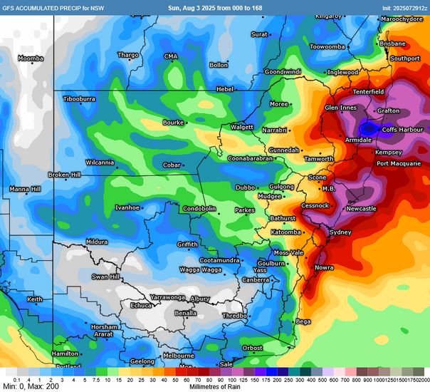 Those onshore winds could deliver moderate to heavy rainfall, potentially triggering flooding in parts of the region. Unlike July's earlier East Coast Low that resulted in very southerly winds, this system’s moisture may push further inland due to the more easterly component resulting a higher potential for rainfall. Gale-force wind gusts are also likely to occur across central eastern NSW, while damaging wind gusts may occur close to the coastline.