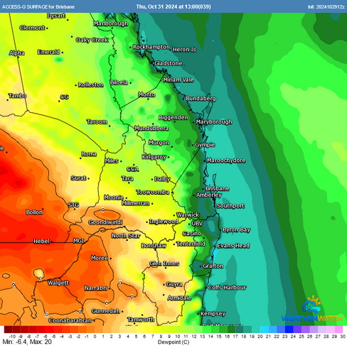 ACCESS surface dew points for Thursday afternoon (12z vs 00z run). It's subtle - but moisture is edging a little further inland which is increasing the chance of storm activity. Source: MetCentre